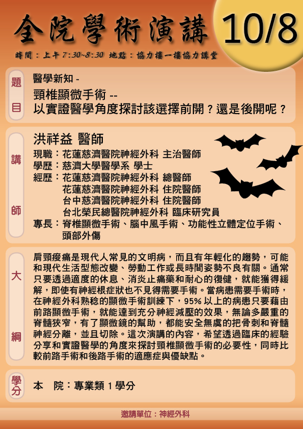 104.10.08【全院學術演講】頸椎顯微手術--以實證醫學角度探討該選擇前開?還是後開呢?|洪祥益 醫師