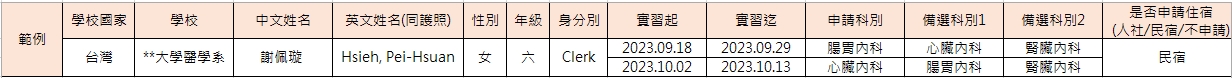 請系辦統一提供學生基本資料(大頭照、身分證及學生證正反面等)(請參閱附件-系辦可自行彙整excel檔,統一提供學生資料)、住宿申請單(如附件)、發文來院(請依本院實習合約書格式發文,可向教學部索取word檔,條文如需更正請洽教學部窗口)
