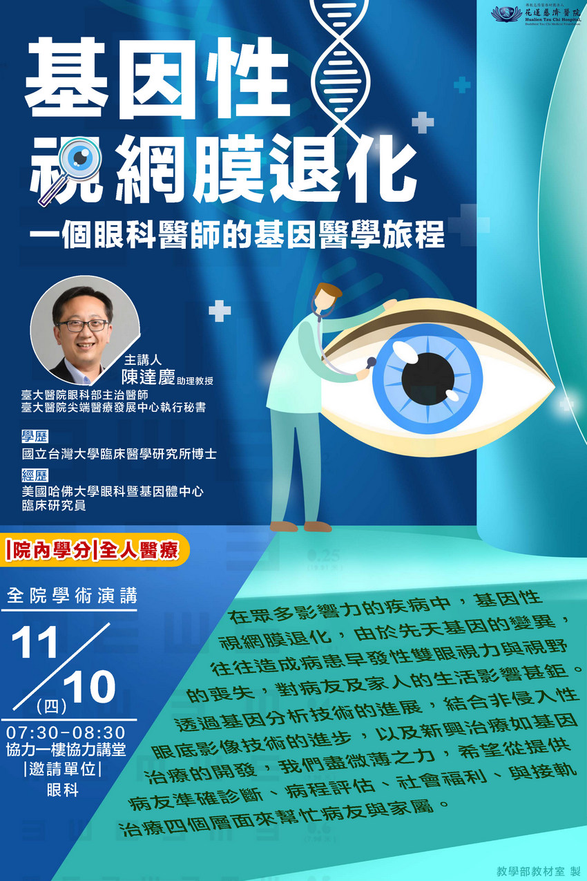 11/10(四) 全院學術演講-基因性視網膜退化 一個眼科醫師的基因醫學旅程-陳達慶助理教授