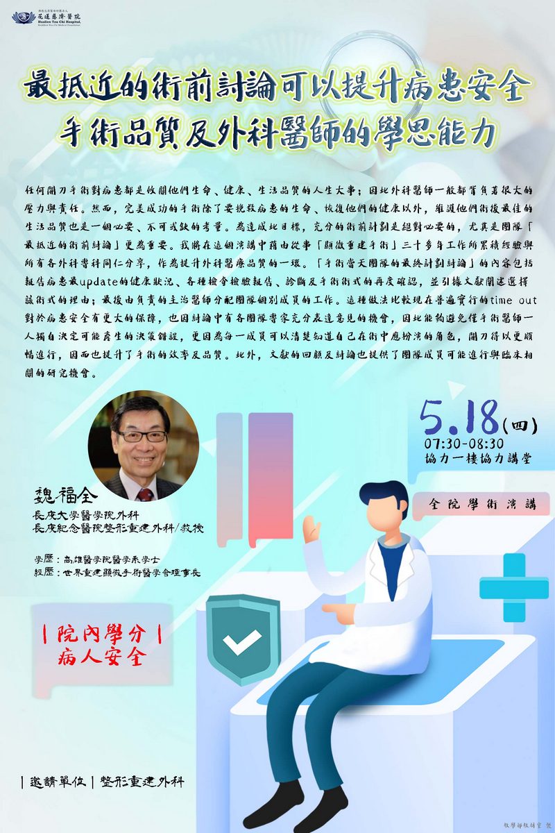 112/05/18(四) 全院學術演講-最抵近的術前討論可以提升病患安全手術品質及外科醫師的學思能力-魏福全院士