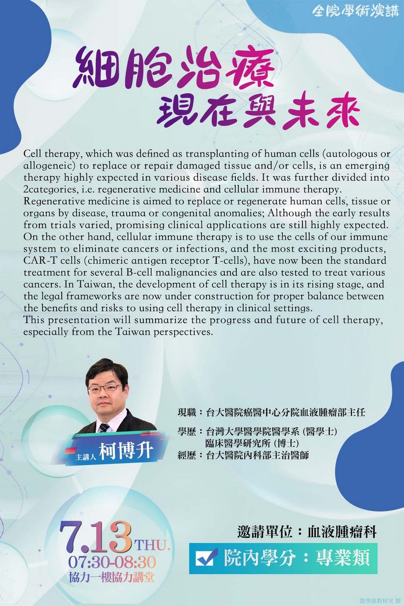 112/7/13(四) 全院學術演講-細胞治療: 現在與未來-柯博升主任