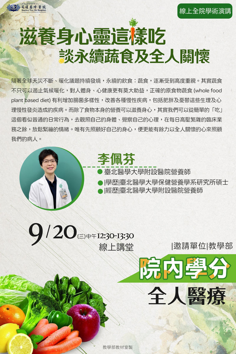 112/9/20(三) 全院學術演講-滋養身心靈這樣吃-談永續蔬食及全人關懷-李佩芬營養師