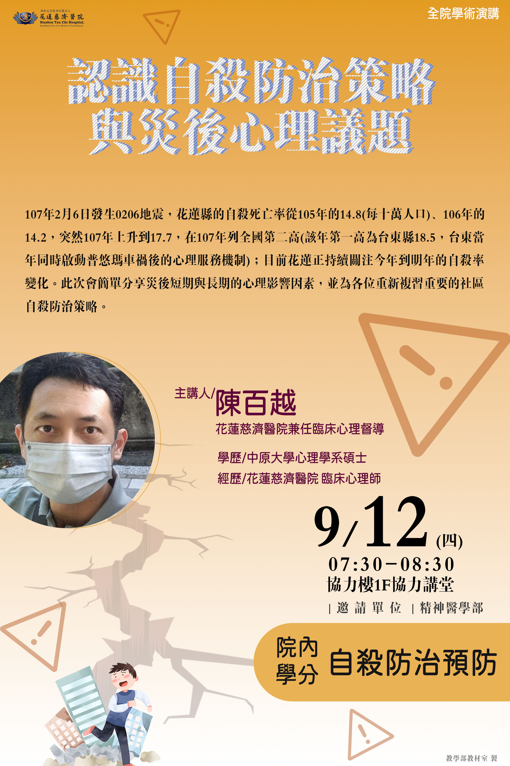 113.09.12 全院學術演講-認識自殺防治策略與災後心裡議題-陳百越督導