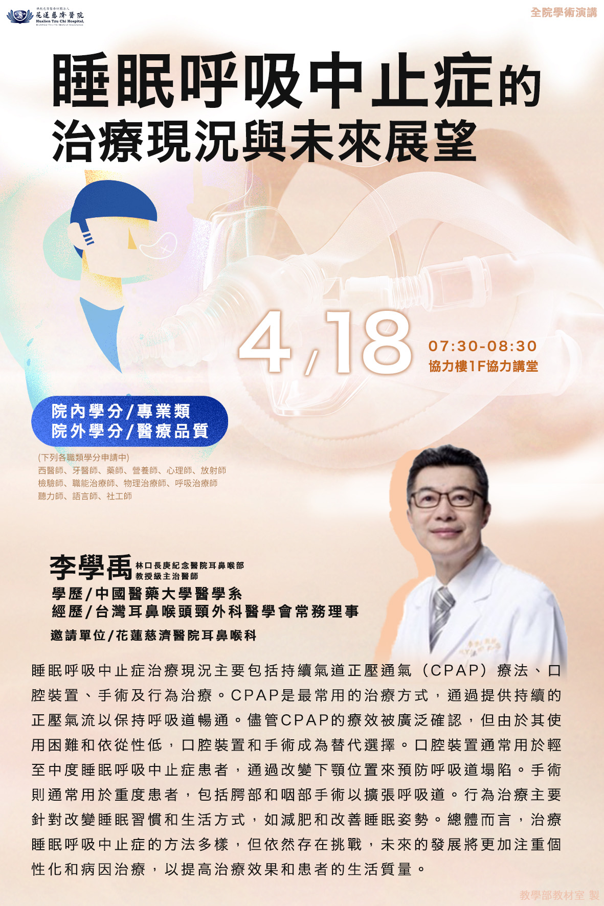 113.04.18 全院學術演講-睡眠呼吸中止症的治療現況與未來展望-李學禹教授