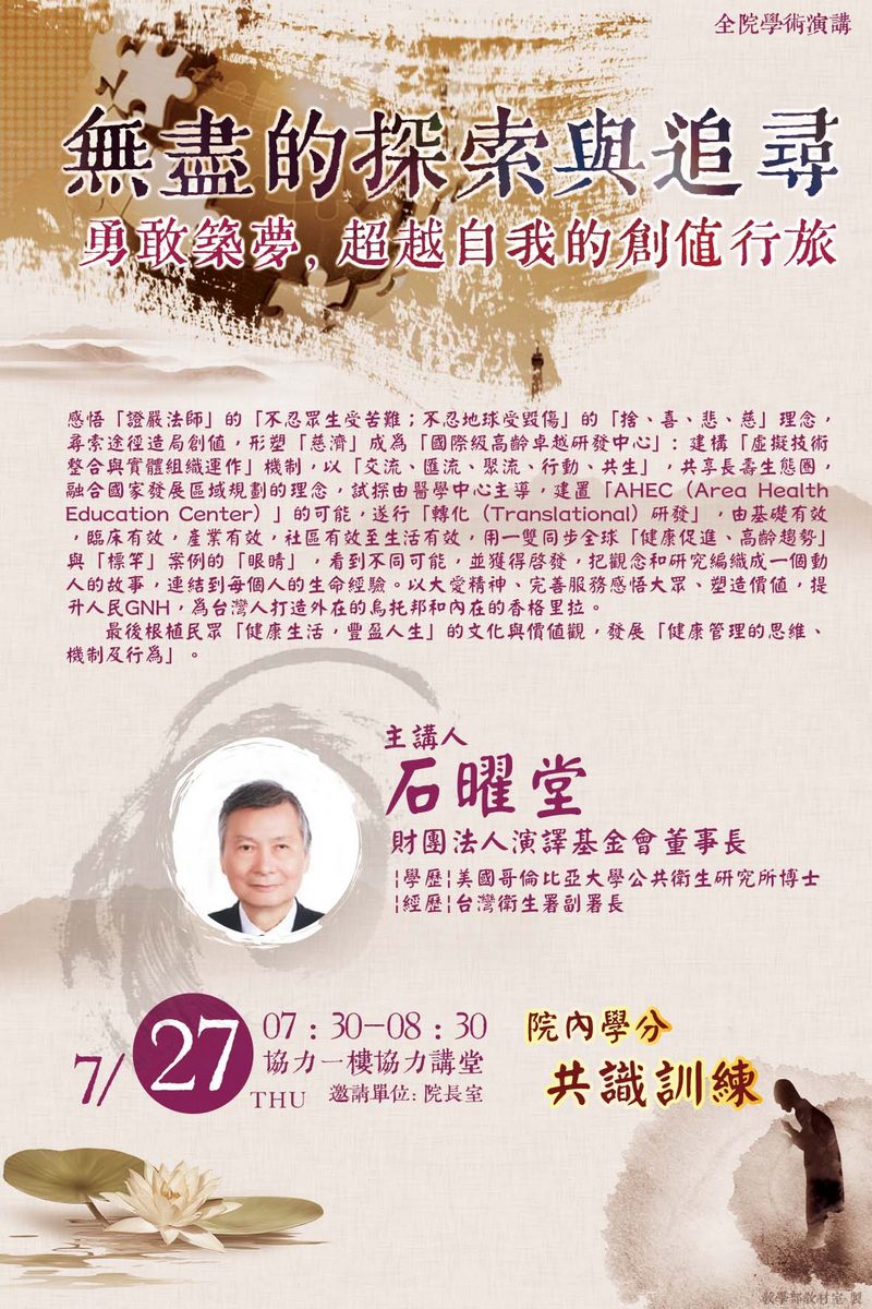 112/7/27(四) 全院學術演講-無盡的探索與追尋 勇敢築夢,超越自我的創值行旅-石曜堂董事長