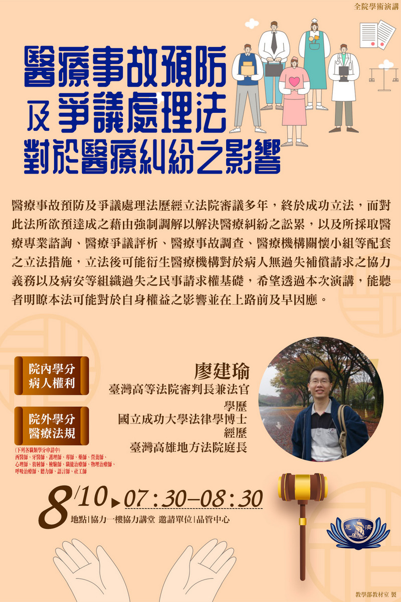 112/8/10(四) 全院學術演講-醫療事故預防及爭議處理法 對於醫療糾紛之影響-廖建瑜法官