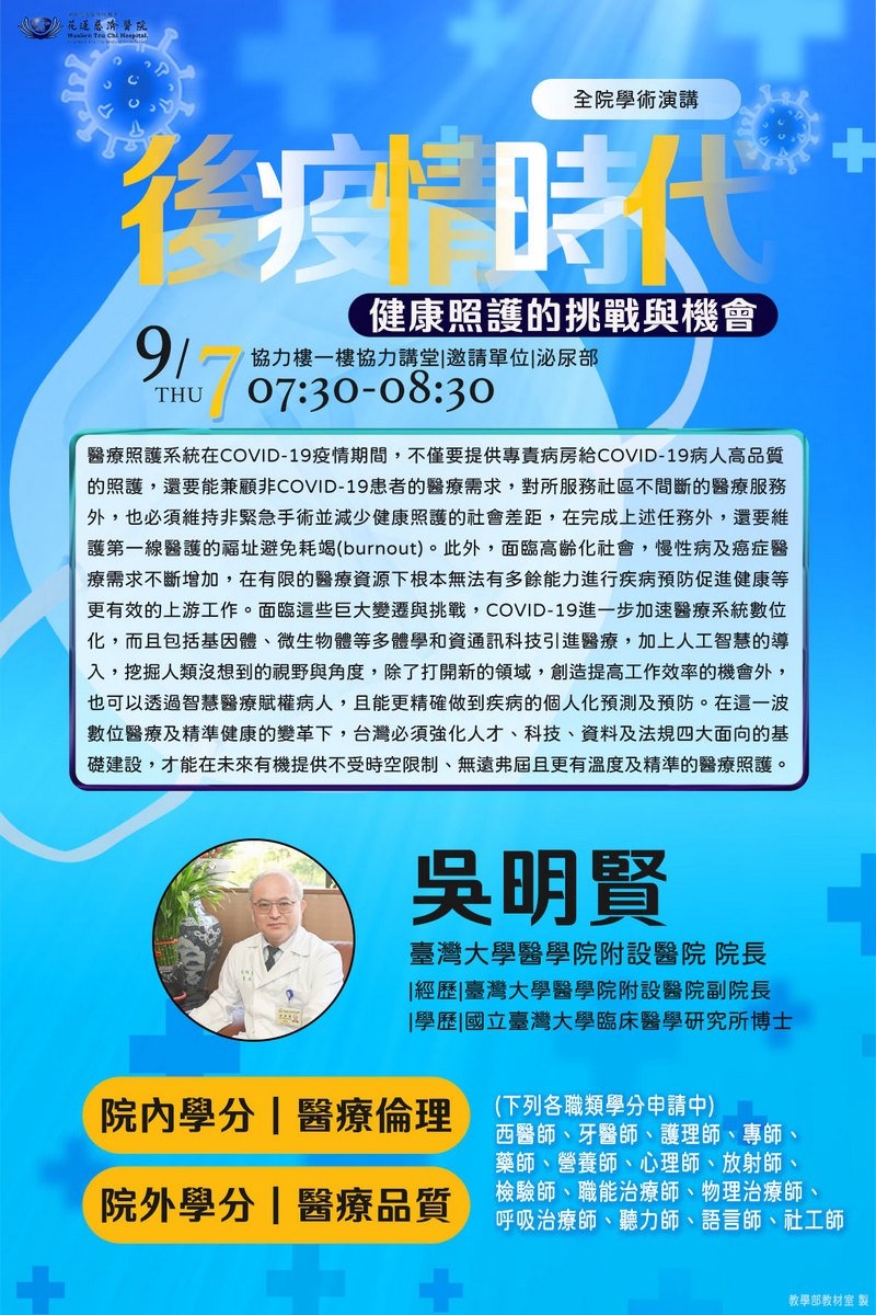 112/9/7(四) 全院學術演講-後疫情時代健康照護的挑戰與機會-吳明賢院長