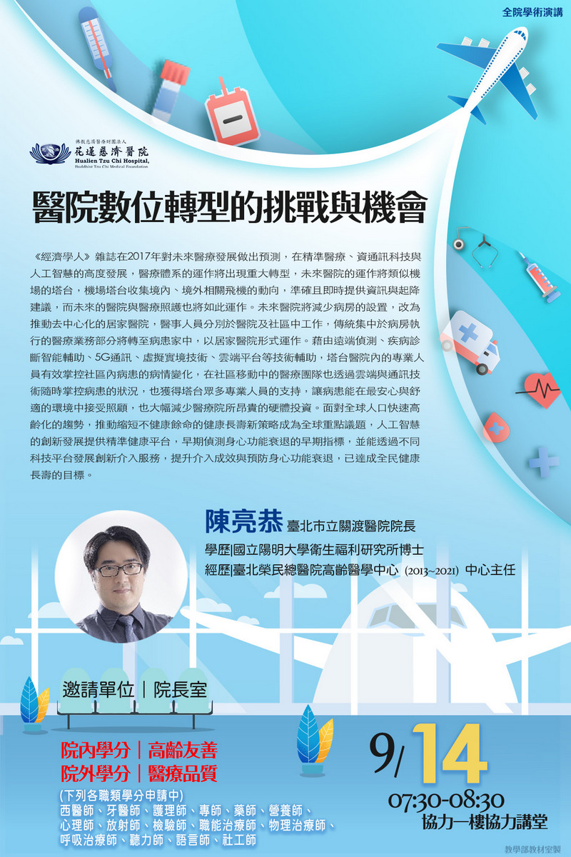 112/9/14(四) 全院學術演講-醫院數位轉型的挑戰與機會-陳亮恭-院長
