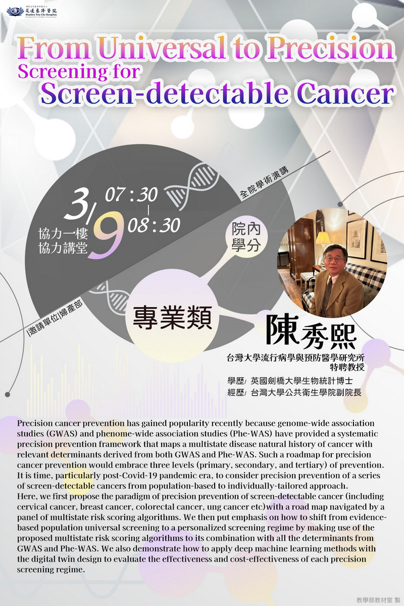 112/03/09(四)全院學術演講-From Universal to Precision Screening for Screen-detectable Cancer -陳秀熙教授