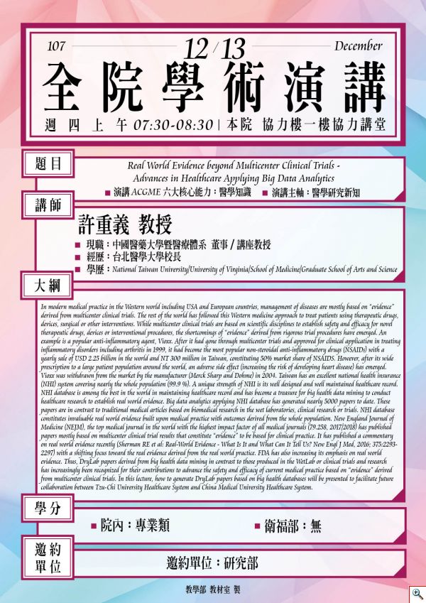 107.12.13【全院學術演講】Real World Evidence beyond Multicenter Clinical Trials -Advances in Healthcare Applying Big Data Analytics