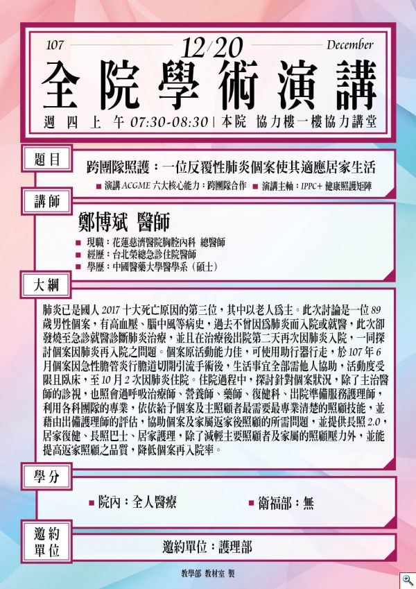 107.12.20【全院學術演講】跨團隊照護:一位反覆性肺炎個案使其適應居家生活