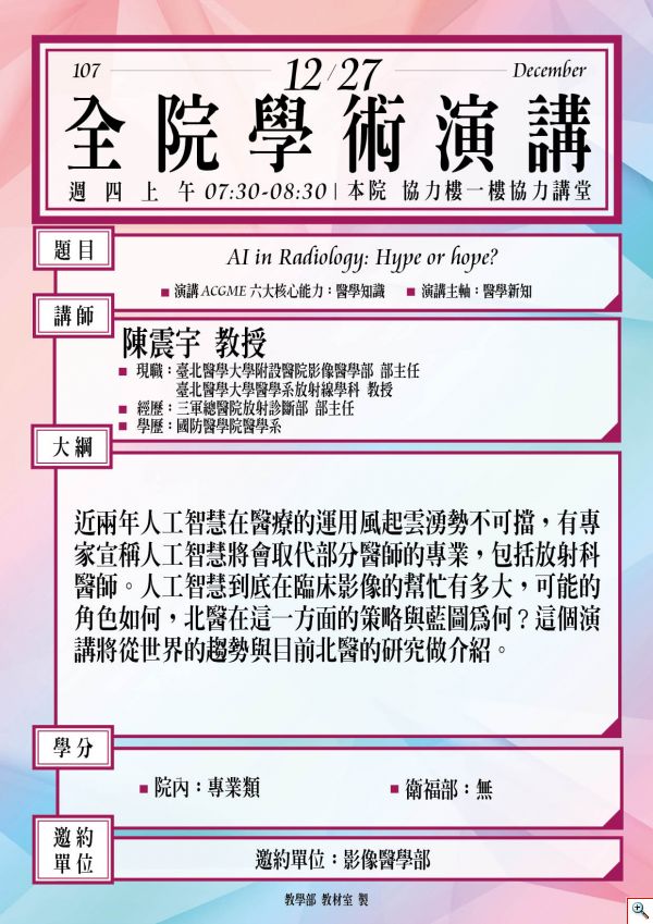 107.12.27【全院學術演講】AI in Radiology:Hype or hope?|陳震宇教授
