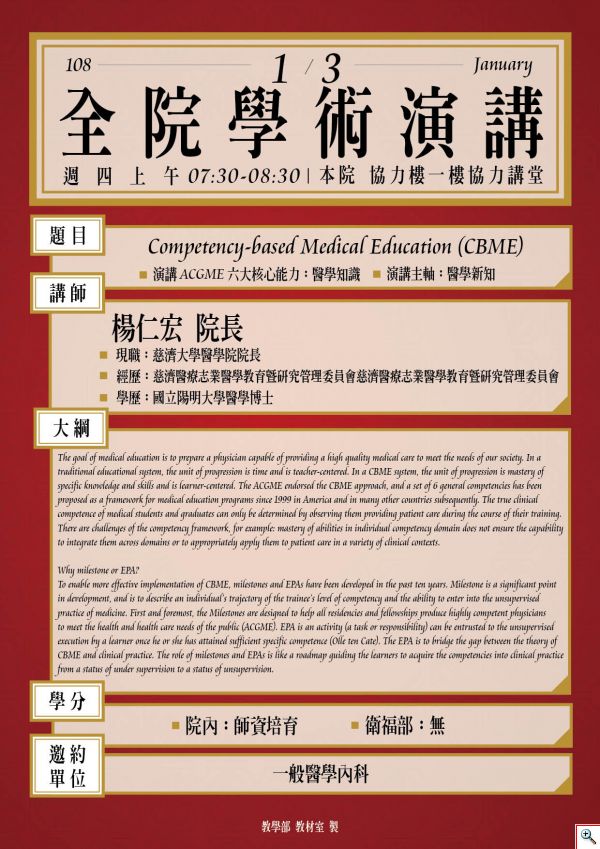 108.01.03【全院學術演講】Competency-based Medical Education (CBME)|楊仁宏院長