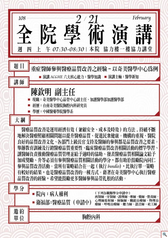 108.02.21【全院學術演講】重症醫師參與醫療品質改善之經驗-以奇美醫學中心為例|陳欽明 副主任